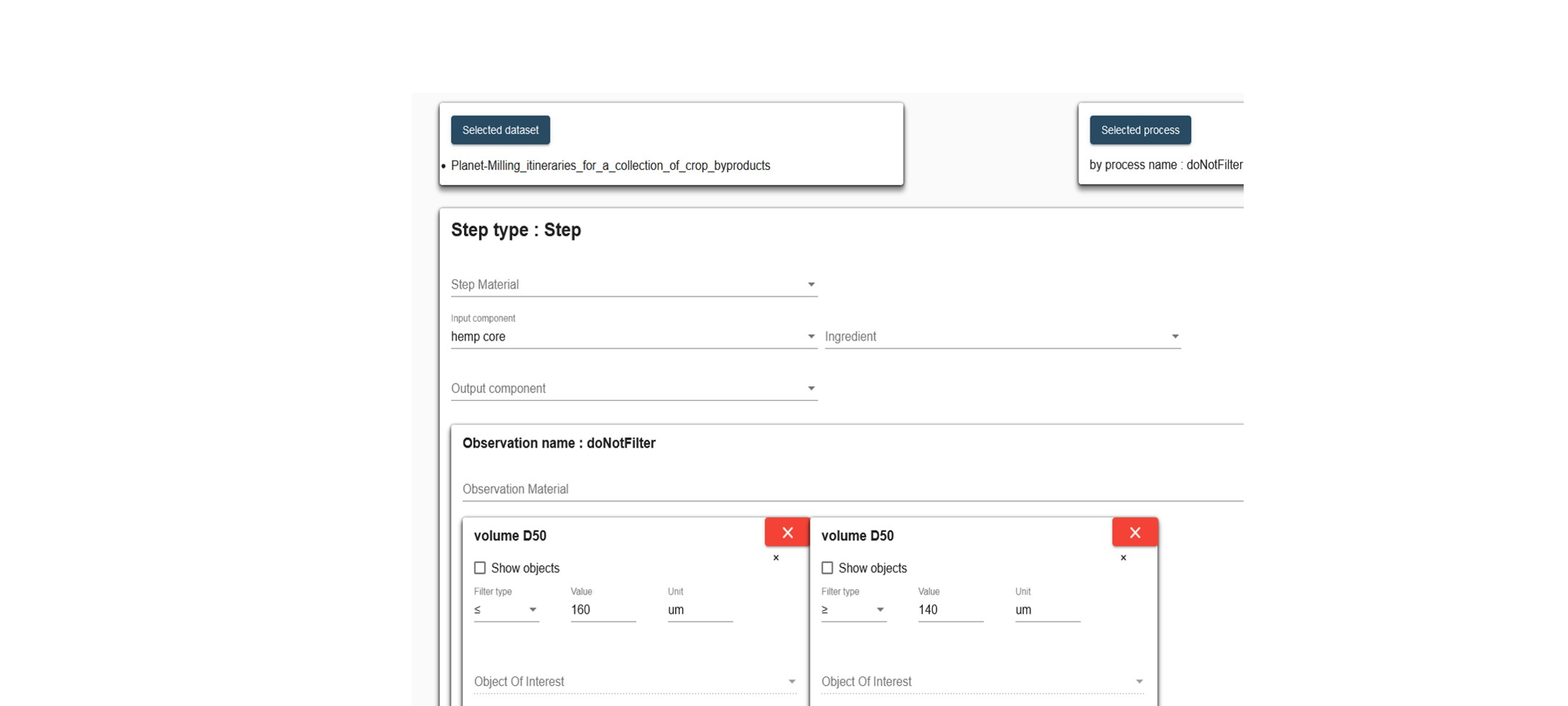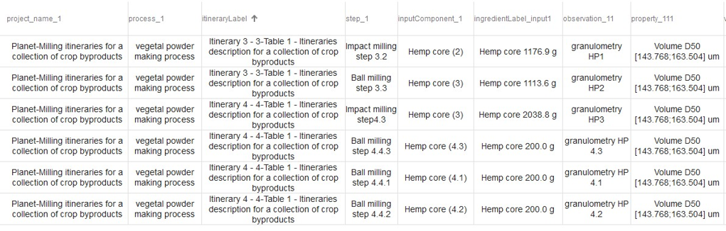 SPO²Q est une application Web qui génère une requête SPARQL conforme à la structuration de l’ontologie PO2/TransformON. L’utilisateur est invité à sélectionner les informations en suivant différentes étapes à l’aide d’un formulaire (Figure 2a). Ici l’utilisateur a sélectionné le dataset correspondant au projet enregistré dans la base graphe. Il a sélectionné une biomasse d’intérêt « hemp core » en composition d’entrée, et il a ensuite pu filtrer les données en indiquant les critères recherchés : un volume D50 compris entre 140 et 160 µm. Le tableau de résultat retourné après exécution de cette requête est montré dans la Figure 2b. Ce tableau est ensuite exportable au format TSV ou JSON. Dans un mode avancé, il est également possible d’utiliser directement l’éditeur SPARQL.