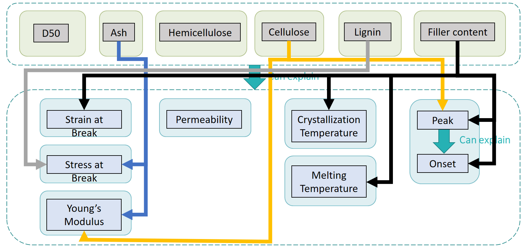 Figure 3 : Découverte de relations de causalité possibles entre variables d’entrée et variables de sortie du modèle de transformation décrivant les composites.