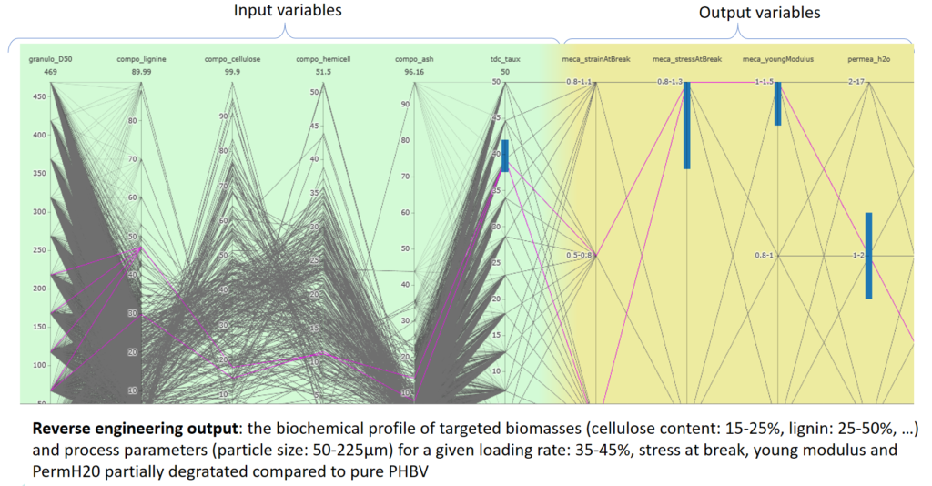L’utilisation de plusieurs modèles a permis de créer un abaque, un ensemble de courbes qui simulent chaque itinéraire virtuel et permettent de trouver une valeur numérique pré-calculée grâce à une représentation graphique (Figure 4). L’abaque comprend plus de 600 000 données générées par les modèles de prédiction, représentant des itinéraires de transformation de poudres végétales virtuelles et de composites dont les caractéristiques sont prédites par le modèle. L’abaque est utilisé en ingénierie inverse pour aider à la conception d’un itinéraire adapté à la production d’un biocomposite avec les caractéristiques recherchées.