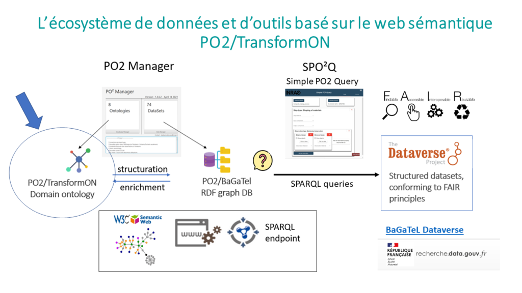 La démarche s’appuie sur la mise en œuvre “by-design” des principes FAIR pour la mise en visibilité des données et leur intelligibilité. L’intelligibilité s’entend ici au sens de compréhension du contexte d’obtention des données grâce à l’utilisation d’une ontologie de domaine permettant de structurer les données et de définir les concepts et le vocabulaire spécifique utilisés par les scientifiques pour décrire les données. La FAIRification repose sur les technologies du web sémantique et sur l’ontologie Process and Observation Ontology (PO2). Ce modèle générique a été spécialisé pour répondre au périmètre des recherches du département TRANSFORM INRAE. Le résultat est l’ontologie de domaine TransformON consultable sur AgroPortal.