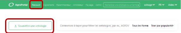 Dans le bandeau vert, cliquez sur « Parcourir » pour afficher la liste des ontologies référencées puis cliquez sur le bouton « Soumettre une ontologie ».