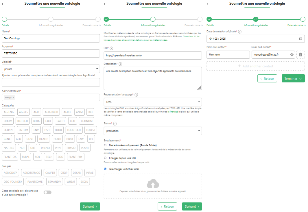 - Emplacement : ceci permet d’indiquer comment le fichier (vocabulaire et/ou métadonnées) est transmis à AgroPortal :