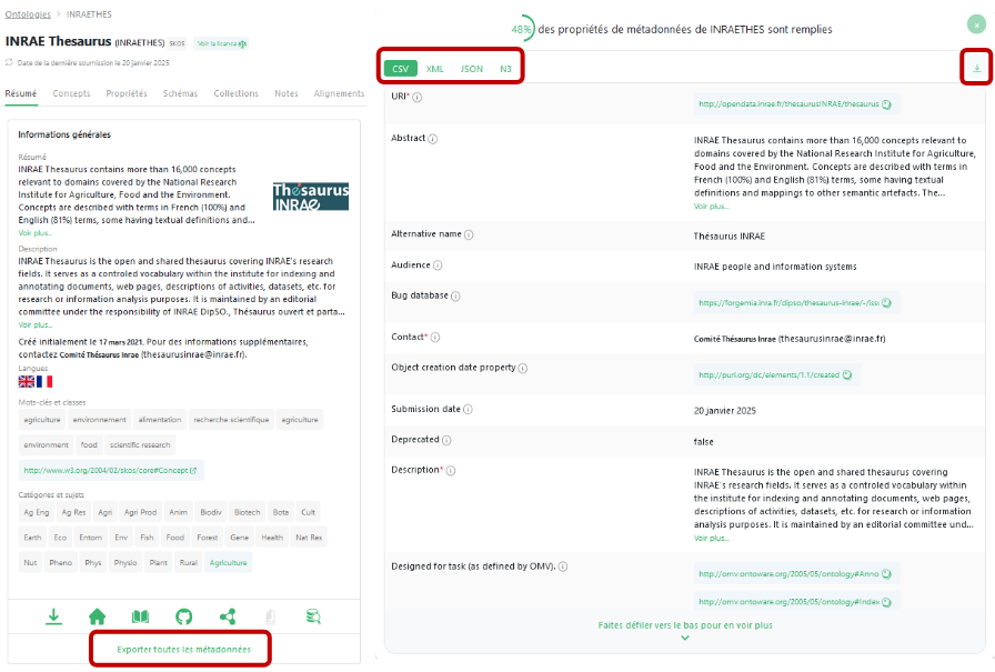 Pour faciliter les futures mises à jour et l’utilisation de votre vocabulaire par des tiers, nous vous recommandons d’inclure les métadonnées dans le fichier. Vous pouvez récupérer les métadonnées que vous venez de saisir en utilisant un des boutons « Exporter toutes les métadonnées » correspondant au format de votre fichier.