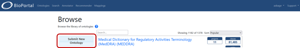 Une fois que vous avez un compte et que vous êtes connecté, cliquez sur « Ontologies » dans le bandeau bleu pour afficher la liste des ontologies référencées. Cliquez sur le bouton « Submit New Ontology ».