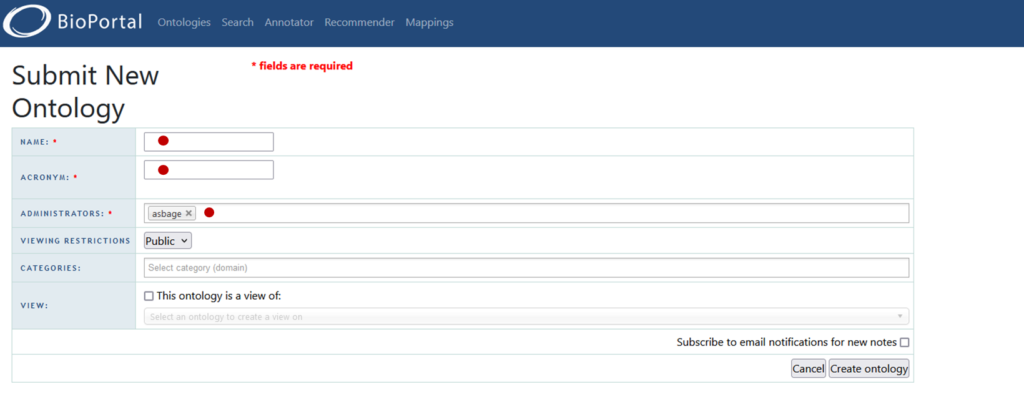 Vous trouverez ci-dessous la procédure pour déposer un vocabulaire sous AgroPortal, celle-ci est identique pour EcoPortal et EarthPortal.