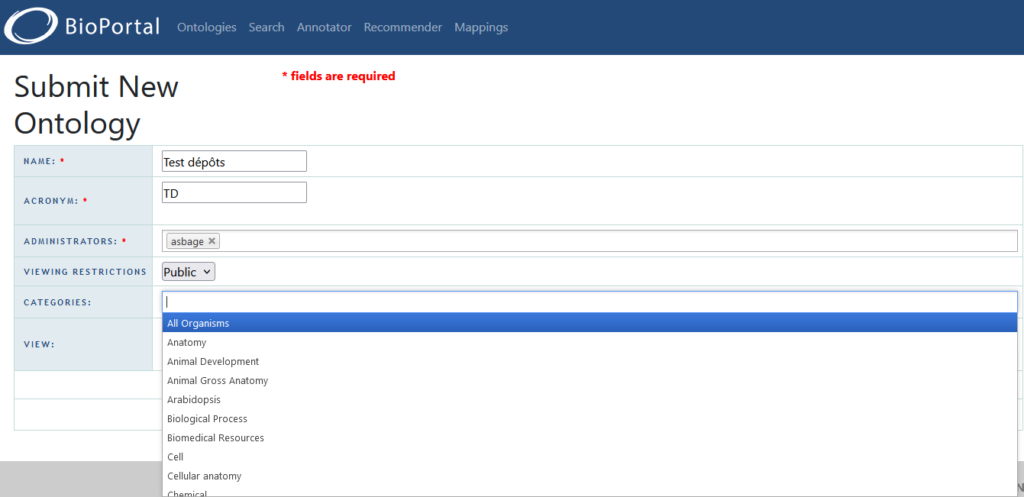 Notez que sur OntoPortal, le terme « Ontology » continue à être utilisé bien que le portail accepte également des vocabulaires SKOS comme les thésaurus.