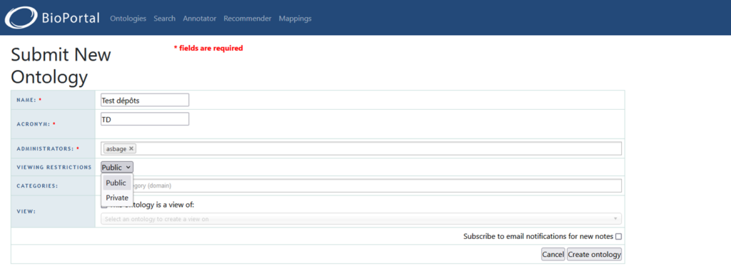 - Visibility : public/private. Cette option permet de temporairement contrôler l’accès à la page du vocabulaire, par exemple le temps de publier un article. Si vous choisissez « private », vous pouvez ensuite accorder l’accès à des comptes AgroPortal spécifiques (un co-auteur, un compte anonyme pour des reviewers…).