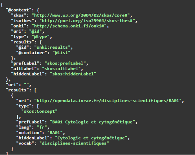 Une API REST permet aux applications d’interroger et d’afficher le référentiel seul (uri = disciplines-scientifiques) ou en même temps que le Thésaurus INRAE.