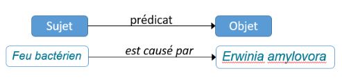 Le sujet représente la ressource à décrire, le prédicat représente une propriété applicable à cette ressource et l’objet représente la valeur de la propriété. Lorsque l’objet est un littéral, on parle de data property et quand il est une référence à une autre ressource RDF, on parle d’object property. Dans le monde du Web sémantique, les ressources (sujet ou objet) et les propriétés (prédicat) sont tous identifiés par des identifiants du web appelés Uniform Resource Identifier (URI). Par commodité, ces identifiants sont abrégés à l’aide d’un préfixe. Par exemple, pour http://www.w3.org/2004/02/skos/core#Concept, on indiquera skos:Concept.
