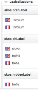 - la propriété skos:prefLabel associe au concept un terme préférentiel, aussi appelé descripteur, dans une langue donnée (ex: Trifolium). Un concept ne peut avoir qu’un terme préférentiel par langue.