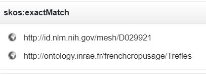 skos:exactMatch http://ontology.inrae.fr/frenchcropusage/Trefles, http://id.nlm.nih.gov/mesh/D029921;